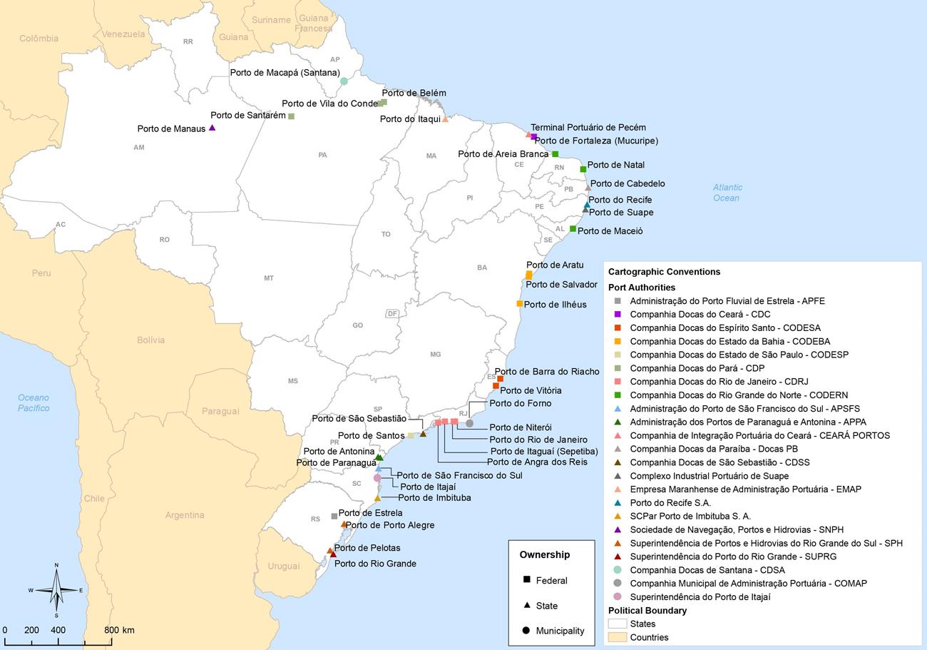 Es gibt 175 Hafenanlagen in Brasilien, bestehend aus etwa 32 öffentlichen Häfen und 143 privaten Häfen, einschließlich See- und Flusshäfen, wie sie in der Hafenkarte Brasiliens aufgeführt sind. Der Hafen von Santos ist der größte Hafen Brasiliens, der Exporte und Importe in die und aus der ganzen Welt ermöglicht. Die Hauptexporte sind Kaffee, Zucker und Soja. Der Hafen wickelt 28 % des gesamten brasilianischen Frachtaufkommens ab und im Jahr 2010 verzeichnete der Hafen von Santos einen Rekordumschlag von fast 97,2 Millionen Tonnen Fracht.